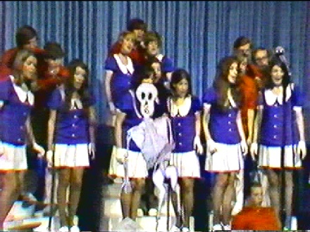 EPILOGUE: When the program finished its live airing on KHOF-TV there was a youth board meeting that occurred immediately afterwards. The videotape that was scheduled to be reran in the next few days was confiscated and prohibited from being rebroadcast. While costumes and hair styles factored into the decision most likely the dancing skeleton would have been considered far too radical for the day and probably tipped the scales towards the decision to ban the replay. Several years later, however, the quarantine was lifted and the program reran many times.